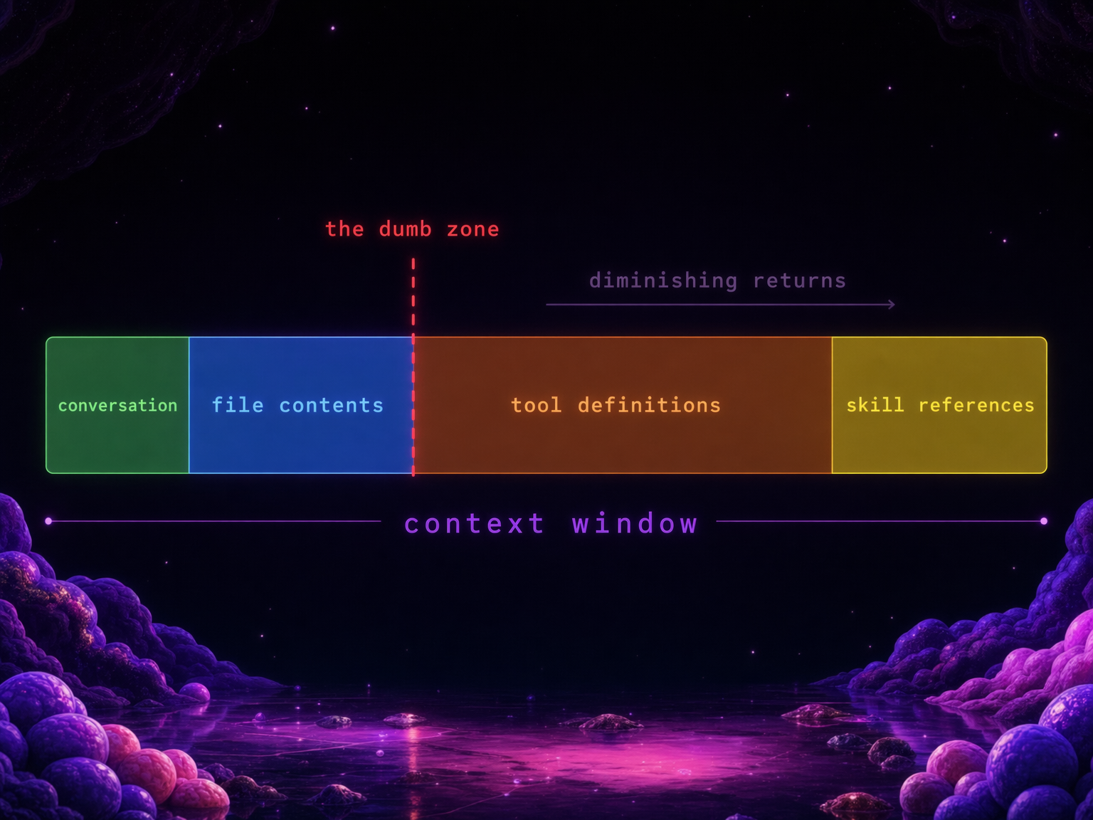 Dex Horthy from HumanLayer calls this the "dumb zone" (5:55). Around 40% context usage, you start seeing diminishing returns. "If you have too many MCPs in your coding agent, you are doing all your work in the dumb zone and you're never going to get good results."