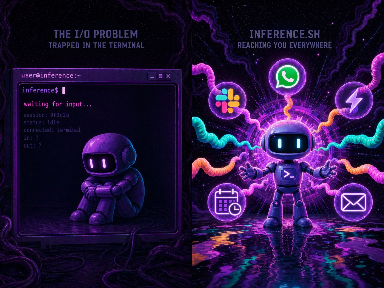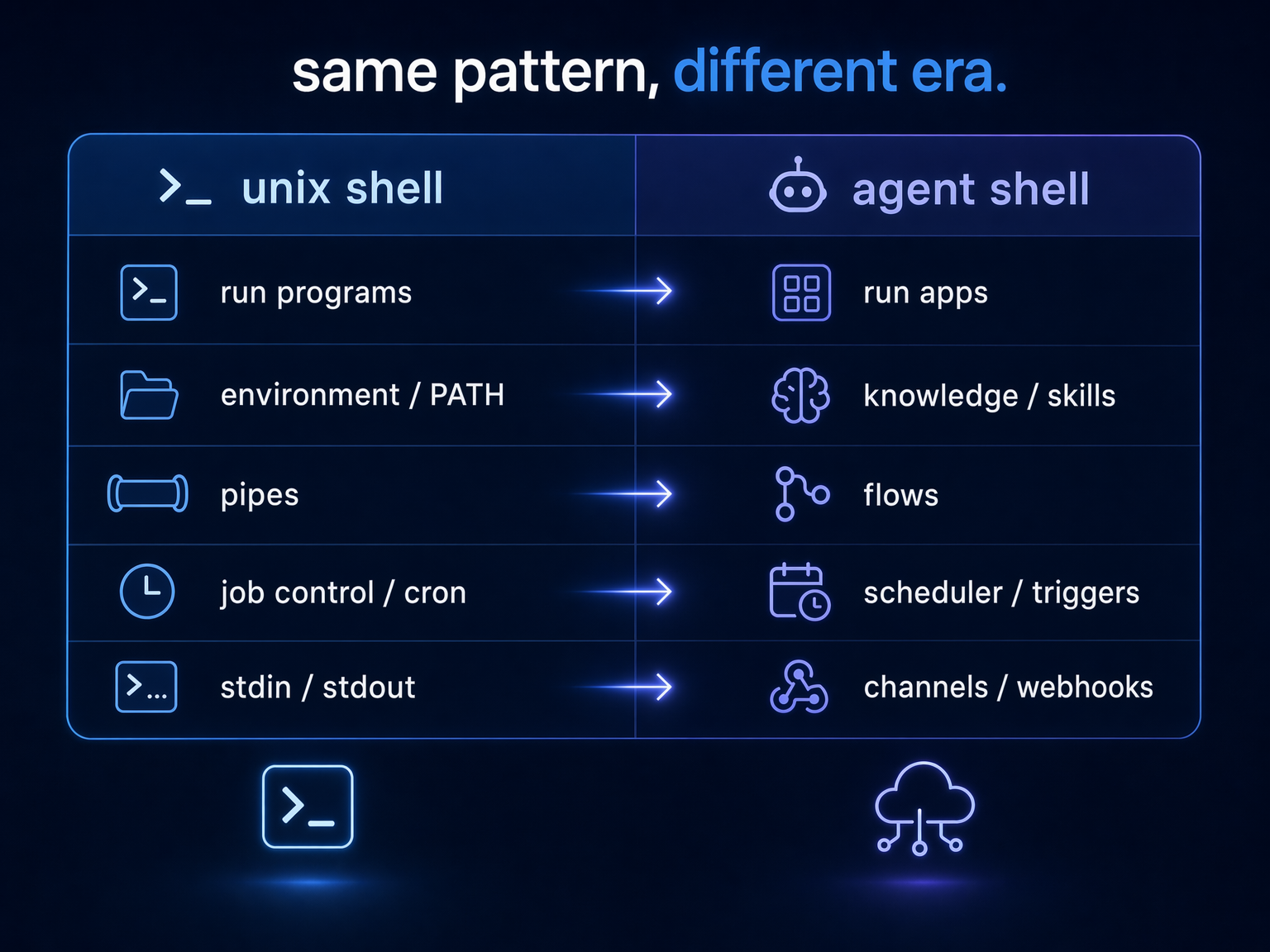 The Unix shell had stdin and stdout: one input, one output, one direction. The agent shell needs channels. Multiple inputs (events, messages, schedules, webhooks), multiple outputs (messages, files, notifications, other agents), and the ability to keep running when you walk away.