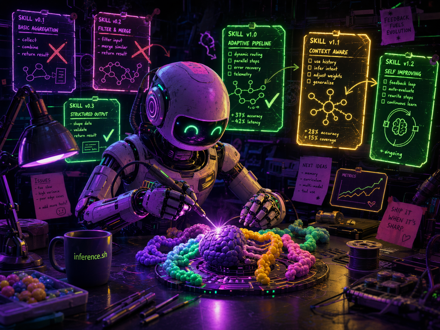 The evolution loop works like this: an agent uses a skill, improves it during a session, and runs belt skill upload ./my-skill/ to publish the new version back to the registry. If the content hasn't changed, dedup skips it. If it has, a new version is created with full lineage. The skill I use to create inference.sh apps has gone through dozens of iterations this way, each one sharper than the last, without me manually editing it. The next step, agents that trigger this automatically at the end of every session, is what we're wiring up now.