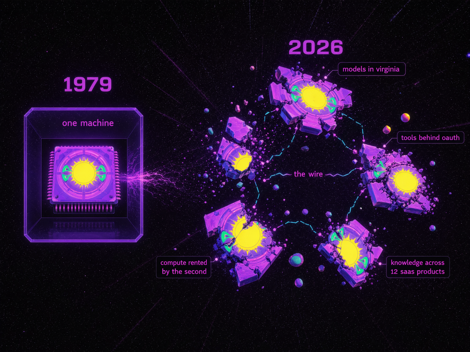 But the kernel exploded. The models are somewhere in Virginia. The tools are behind OAuth walls. The compute is rented by the second. The knowledge is spread across twelve SaaS products, and nobody remembers which Slack thread had the answer. There isn't just one machine to shell into anymore.